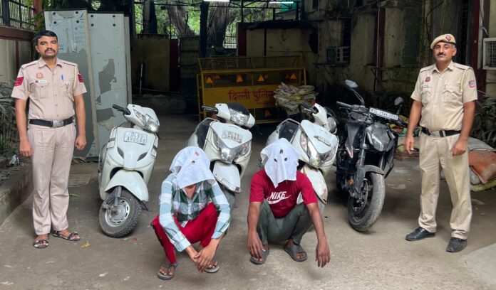 असल न्यूज़। राजधानी दिल्ली की थाना गुलाबी बाग और अंधा मुगल पुलिस चौकी की टीम ने वाहन चोरी और लूट करने वाले शातिर बदमाशों को गिरफ्तार किया है। पकड़े गए आरोपियों में हेमंत उर्फ अंकुश और सौरभ उर्फ गोलू है। दोनों के खिलाफ दिल्ली के अलग-अलग थानों में लूटपाट, चेन झपटमारी और चोरी जैसे कई मामले दर्ज हैं। इनकी गिरफ्तारी से पुलिस ने वाहन चोरी के चार मामले सुलझाने का दावा किया है।