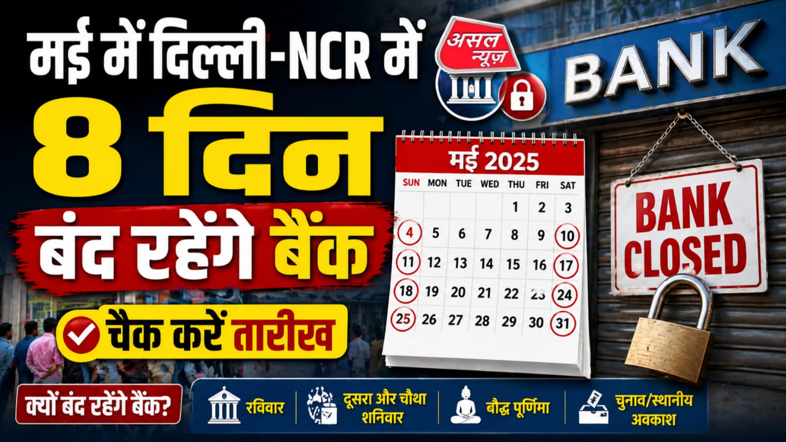 असल न्यूज़: दिल्ली-NCR के बैंक ग्राहकों के लिए मई 2026 का महीना छुट्टियों से भरा रहने वाला है। भारतीय रिज़र्व बैंक (RBI) की हॉलिडे लिस्ट के अनुसार इस महीने कुल 8 दिन बैंक ब्रांच बंद रहेंगी। ऐसे में ग्राहकों को सलाह दी गई है कि जरूरी बैंकिंग काम पहले ही निपटा लें।